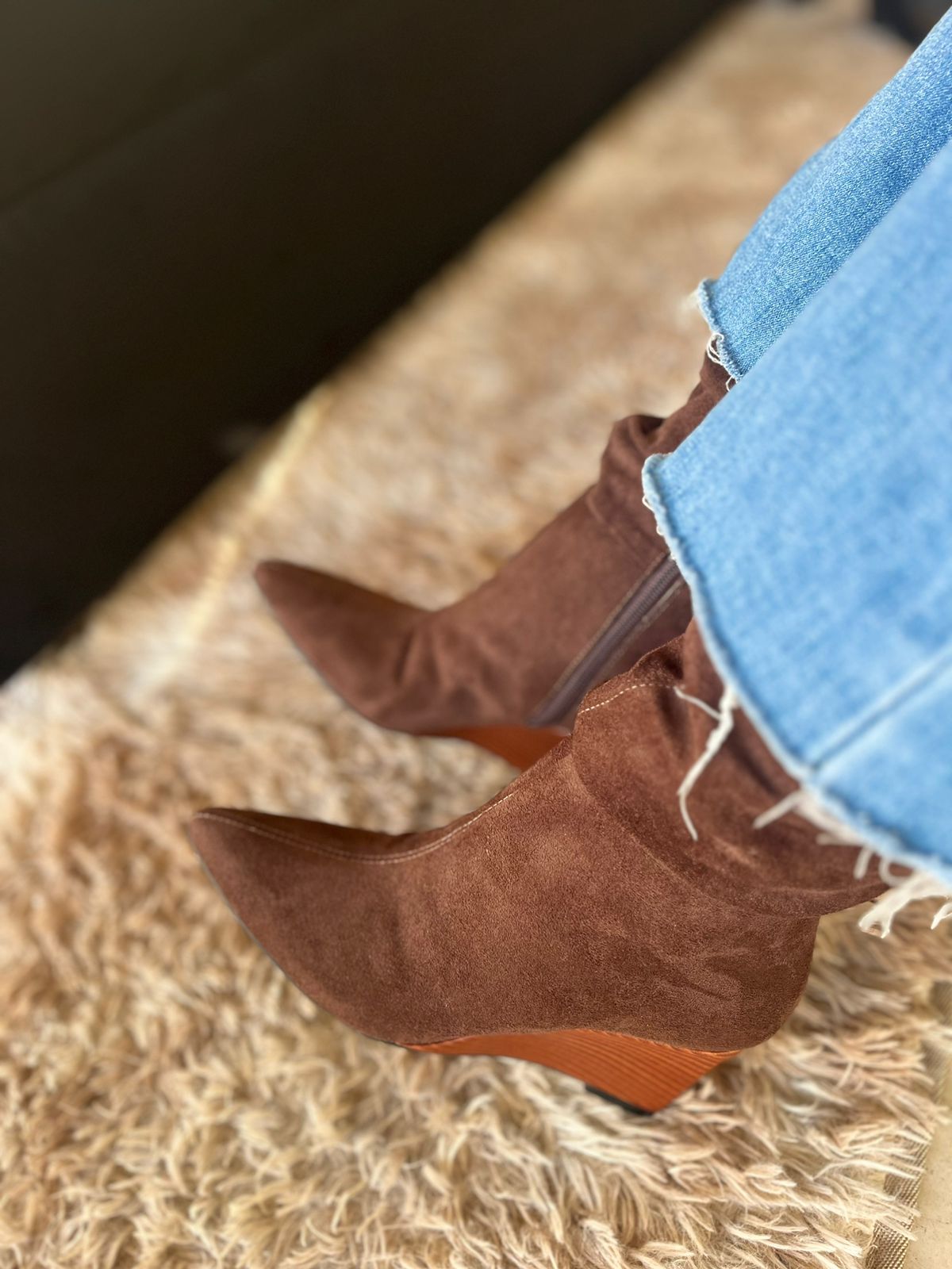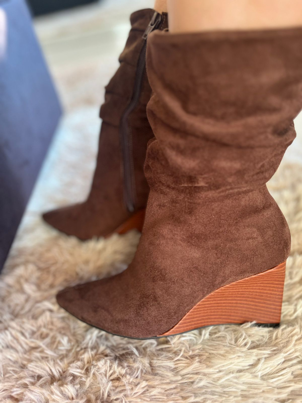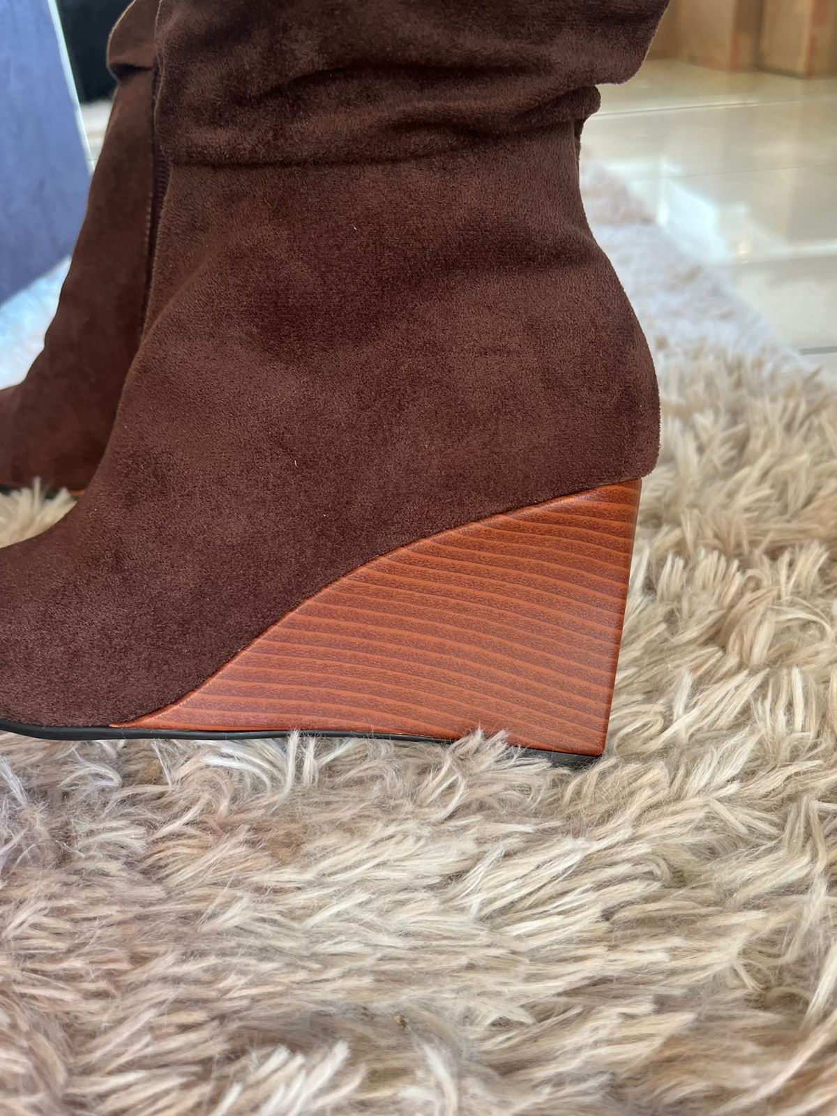 Bota em camurça na cor marrom, com design moderno e elegante. Possui cano médio, que traz um toque estiloso ao visual. O fechamento em zíper lateral facilita o calce, garantindo praticidade no dia a dia.